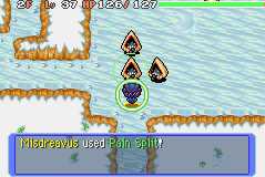 | Misdreavus slams its body into the opponent. Then, a beam of energy comes out of the healthier Pokémon, transferring its health to the weaker Pokémon. | |||