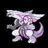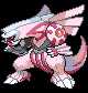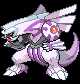 In its Origin Forme, which is said to be its true form, Palkia's appearance changes drastically from its other theropod-like Forme, taking on a centaur-dragon hybrid look while resembling its creator,Arceus. The main body becomes larger and grayish pink, with light gray accents on the tips of its wings and legs, along with various dark purple accents. Its shoulder plates are larger and seem to be made of the same pearl-like crystals as the ones embedded at the center, with six rectangular dark purple protrusions surrounding them. Its lower half becomes bigger and resembles that of a horse. Palkia's arms become its forelegs, with hooves, protrusions on the knees, and rectangular spikes on its upper forelegs akin to its other Forme's arms. The back legs gain hooves as well, with heels on the back of the foot, and they are bent in such a way that allows Palkia to stand up on its two back legs. The tail becomes shorter and splits into five. On the center of Palkia's abdomen is a structure consisting of two dark purple circular shapes connected to two circles of the same color, resembling Arceus's cross-like wheel. Palkia's neck and markings on its lower body become shorter. The pointed crest on its neck becomes taller and longer. Its lower jaw gets a plate-like mask covering it, with multiple spikes all over it: one at the front, a pair extending towards the bottom of the jaw, and two pairs on either side extending towards the back. The plate-like mask can be lowered to reveal its mouth when roaring or using attacks.