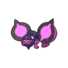 Pecharunt is a small Pokémon resembling a piece ofmochi. It has two forms it can take both inside and outside of battle. The first form resembles an upside-down peach, with a black circular face at the center and a thin, vertical line splitting its body into two halves. In its face are two white semicircle eyes, appearing to be frowning. It takes its second form upon opening up, revealing a smaller inner body resembling a peach's pit. It has a darker purple and pink body with two white eyes which are usually frowning, below which is a white, ribbon-shaped mouth. On its head rests two purple flaps and a scorpion-like ponytail. It has two heart-shaped paws at the bottom of its body, along with three black dots on each side underneath them. The discarded shell floats on both sides of Pecharunt, forming spiky wing-like appendages. The inside of these shells have a bright pink glow, outlined in black. The bright pink extends slightly through the black outline in six thin lines. The chains have a magenta color to them and are divided in identical segments, ending in a slightly larger segment with two protrusions, making it resemble the shape of Pecharunt's shell.