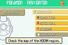 The PokéNav displays a map ofHoenn, along with the current location of its owner. It is also possible to zoom in to display a basic layout of towns and cities with important buildings differentiated by color.