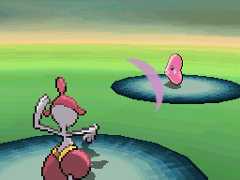 | Meditite waves one of its arms upward and a wave of psychic energy is released from its arm at the opponent. As it waves its arm, a trail of energy is left behind. | |||