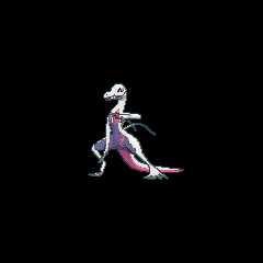 Salazzle is a dark grayPokémon resembling a salamander or lizard. Its thin body has a grayish purple underside with several wavy, dark pink markings: a U-shaped marking with two additional lines inside on its chest and one on each hip resembling wisps of smoke. The dark gray on its head and neck extends slightly onto its chest in a V-shape. It has a slender head with purple, almond-shaped eyes with slit pupils and two fang-like projections on each side of its lower jaw. There are two thin, wavy growths on its back at the base of its tail, which is whip-like with a dark pink underside. Its hands and feet each have five long, thin digits, with dark pink palms that can unleash flames. Salazzle is a female-only species with no known male counterpart, as the male Salandit cannot evolve due to malnutrition.