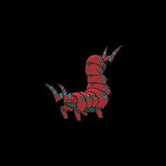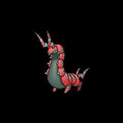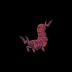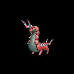 Scolipede lives in lush forests. It is very aggressive and will not give up until victorious. This Pokémon chases down enemies with great speed and then attacks relentlessly with its horns until it prevails. It catches its prey using the toxic spike claws on its neck. Once the prey becomes immobile, Scolipede slams it into the ground to inject it with its powerful venom. Similarly to its pre-Evolution,Whirlipede, it can curl up into a ball and roll towards its targets. Scolipede andCentiskorch can get into territorial fights, which end with the loser becoming the winner's prey. While sleeping, Scolipede may curl up into a ball shape.