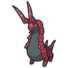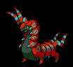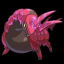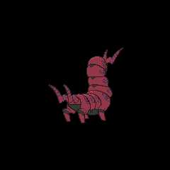 As Mega Scolipede, its chest has become coated in a thick plate of lavender armor with two small bumps near the bottom; its smaller fore-claws also gain armor, as do its head and forelegs. The armor on the first two of its foreclaws is the largest and most bulbous. Each of the armor plates on its foreclaws, as well as its thighs, are also marked by black circles with bright, magenta, eye-like shapes surrounding them. Mega Scolipede's foreclaws themselves also turn the same shade of magenta. Its horns have grown dramatically, colored with alternating stripes of dark purple and black and tapering into luminous green spikes. Some bands around the segments in its armor, the outline of its underbelly, and its eyes have also become accentuated by this luminous green. Mega Scolipede's tails become fashioned similarly to its antennae, but lack the characteristic green tips.