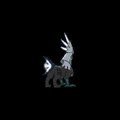 Silvally is a quadrupedal, chimericPokémon with traits from a variety of creatures, with an appearance nearly identical to its pre-Evolution,Type: Null. It has a mammalian head with mechanical parts. Covering most of its head and neck is a thick, silver mane that extends down over its chest. Its blunt snout is metallic on the bridge of its nose and upper jaw. Silvally has a triangular black nose framed by three red lines, pointed ears with bright pink and black insides, one visible fang on each side of its lower jaw, and a slight overbite. Its eyes are bright silver, have no visible pupils, and appear to be surrounded by an empty, black space. On each side of its head is a circular, metallicdrive, with a white circle crossed by a metal line. On top of its head is a large, axe-like fur or feather crest. The tip of the crest has a hooked, metallic piece, while the back has three white feathers. Silvally's lower body is mostly covered in short, black fur. The lower half of each front leg is insectoid and green with spikes along the back, while the rear legs have thick purple scales on the flanks, shins, and the top of the foot. All four of its feet have three toes, but in the front two toes face forward and one backward. Additionally, the hind paws have a short, gray claw on the back of the ankle. Its fishlike tail consists of two dark blue spines with a white fin stretched between them. The top spine has a line of short, gray spikes.