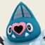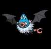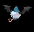 Swoobat is a blue, bat-likePokémon. It has fused, pointed ears with striated, lighter-colored insides and a pink, heart-shaped snout with a single nostril. Two wide, rounded teeth are visible in its lower jaw. A mane of shaggy, light blue fur surrounds its neck. Its black wings have a claw at the joint, and its small black feet have three toes each. It has a bare, pink tail that is twisted with two short prongs at the tip.