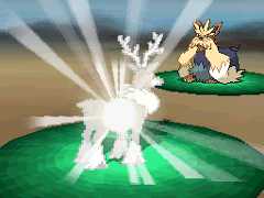 | Lurantis's body becomes surrounded by white sparkles and its body glows white, healing its injuries. | |||