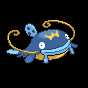 Whiscash is a dark blue, chubby catfish-likePokémon with a yellow underbelly. It has a cavernous mouth with light blue lips that have short, thin whiskers growing from the lower lips. Long, yellow barbels grow from its cheeks, and there is a yellow marking on its forehead that resembles a W. The light blue dorsal fin has a pattern of three black spots arranged in a triangle, while its horizontal tail fin lacks spots. Its pectoral fins and belly fins match its main body color.