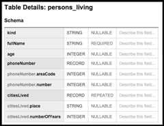 The following BigQuery table,persons_living, displays a typical schema that stores example user data, includingfullName,age,phoneNumber, andcitiesLived along with the datatype andmode of each column. The schema shows that the values in thecitiesLived column are repeated, indicating that some users may have lived in multiple cities: