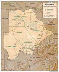 TheRepublic of Botswana is a landlocked nation in Southern Africa. Formerly the British protectorate of Bechuanaland, Botswana adopted its new name after becoming independent within the Commonwealth on September 30, 1966. It is bordered by► South Africa to the south and southeast,► Namibia to the west,► Zambia to the north, and► Zimbabwe to the northeast. The economy, closely tied to South Africa's, is dominated by mining (especially diamonds), cattle, and tourism. The country is named after its largest ethnic group, the Tswana. | | SeTswana | Botswana - Lefatshe la Botswana