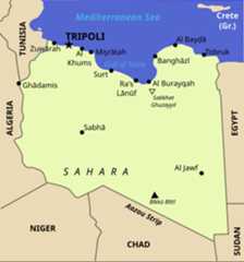 Libya is a country in North Africa. Bordering the Mediterranean Sea to the north, Libya lies between► Egypt to the east,► Sudan to the southeast,► Chad and► Niger to the south, and► Algeria and► Tunisia to the west. With an area of almost 1.8 million square kilometres (700,000 sq mi), 90% of which is desert, Libya is the fourth largest country in Africa by area, and the 17th largest in the world. The capital, Tripoli, is home to 1.7 million of Libya's 5.7 million people. The three traditional parts of the country are Tripolitania, the Fezzan and Cyrenaica. | | Other languages | Italian: Libia a o semplicemente Libia, è uno Stato del Nordafrica confinante con il Mar Mediterraneo e compreso tra l'Egitto ad est, il Sudan a sudest, il Ciad e il Niger a sud e l'Algeria e la Tunisia ad ovest. La sua capitale è Tripoli. | |