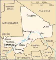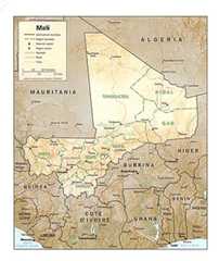 LaRépublique du Mali est un état d'Afrique de l'Ouest ayant des frontières communes avec la Mauritanie et l'Algérie au nord, avec le Niger à l'est, avec le Burkina Faso et la Côte d'Ivoire au sud, avec la Guinée au sud-ouest et avec le Sénégal à l'ouest. Le point le plus haut est le Hombori Tondo (1155 m) situé dans la partie centrale du pays. Ancienne colonie française, le Mali (alors République soudanaise) devient indépendant en 1960. | | Bamanankan | Mali - ?