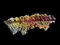 Синтезированные кристаллы висмута. Для сравнения показан кубик из висмута объёмом 1 см³.