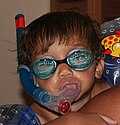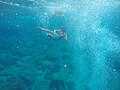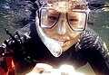 English: Snorkeling is swimming underwater while breathing through a tube that goes above the surface.