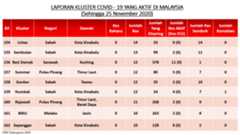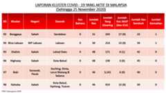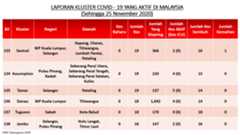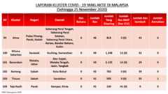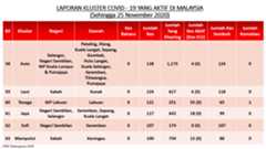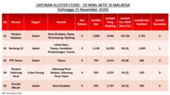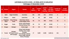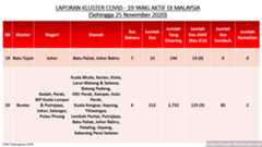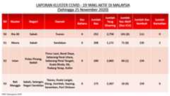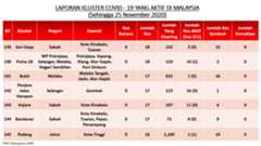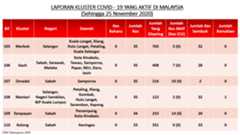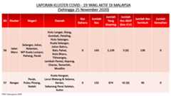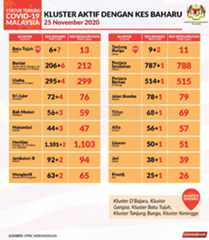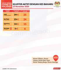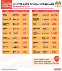 Sehingga 25 November 2020, terdapat sebanyak339 kluster telah dilaporkan termasuklima (5) kluster baru yang dilaporkan pada hari ini. Jumlah kluster yang telah tamat pula adalah sebanyak170 kluster dengantiga (3) kluster yang tamat pada hari ini iaitu Kluster Idaman, Kluster Bayu dan Kluster Bah Kota. Ini menjadikan jumlah kluster aktif yang dipantau adalah sebanyak169 kluster. Daripada jumlah tersebut, sebanyak40 kluster melaporkan pertambahan kes. Kluster-kluster yang melaporkan pertambahan kes baharu tertinggi pada hari ini adalahKluster Bakti (301 kes), Kluster D’Bajaru (56 kes) dan Kluster Pengkalan Barat (40 kes).
