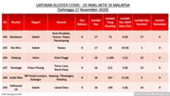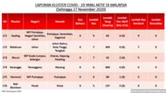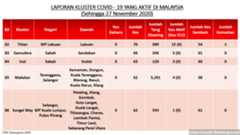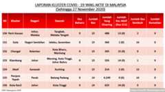 Setakat 27 Nov 2020, 349 kluster dilaporkan termasuk 4 hari ini. 173 telah ditamatkan, bermakna tinggal 176 kluster lagi yang masih aktif.