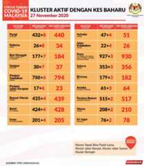 Sehingga 27 November 2020, terdapat sebanyak349 kluster telah dilaporkan termasukempat (4) kluster baharu yang dilaporkan pada hari ini. Jumlahkluster yang telah tamat pula adalah sebanyak 173 kluster dengan satu (1) kluster yang tamat pada hari ini iaitu Kluster Omadal. Ini menjadikan jumlah kluster aktif yang dipantau adalah sebanyak 176 kluster. Daripada jumlah tersebut, sebanyak47 kluster melaporkan pertambahan kes. Kluster-kluster yang melaporkan pertambahan kes baharu tertinggi pada hari ini adalahKluster Tapak Bina Puteh Lama (118 kes), Kluster Jalan Haruan (116 kes) dan Kluster Jalan Tuaran (43 kes).