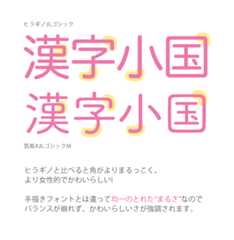 筑紫A丸ゴシックは通常の丸ゴシックよりふところがしぼられて小さくなっています。(「ふところ」は画と画が構成している内側の空間のことです。)そのせいで、丸ゴシックの可愛らしさを持ちながらも、どことなく明朝体のような和の雰囲気や伝統的な感じがします。かわいいのによく見るとぐっと大人っぽい印象をもつこのフォントにギャップ萌えを禁じ得ません;D