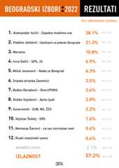Izlaznost, na osnovu 99 odsto obrađenog uzorka na beogradskim izborima iznosi 57,2 odsto (margina greške 0,5).