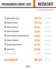 izbori 2022Izlaznost, na osnovu 99 odsto obrađenog uzorka na predsedničkim izborima iznosi 58,6 odsto (margina greške 1).