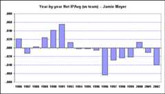But every year we say to ourselves that there must be some aspect of his ability that doesn't show up in fielding studies. But don't you think that if Alomar was truly the best at his position in the history of baseball, he'd score well at least once in nine years? Is it really possible that external factors or quirks in the data would make him look worse every single year?