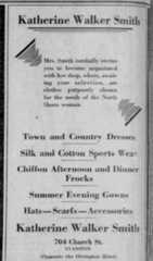 In August of 1918, Felix Smith died at the age of forty-one, following complications from an appendectomy. Katherine was left with two young children and Felix's fledgling refrigerator factory, which was struggling in the midst of World War I. According to a newspaper account, "she sold the factory for what she could get. Her situation had made her think in business terms and consider seriously what business ability she had. That ability seemed to lie in selling, although selling the idea that woman suffrage would not destroy the universe to conservative Missouri voters measured the extent of her contact with the public." Katherine decided to move to Evanston, Illinois, home of Northwestern University, and open a ladies' clothing store, a "dainty gray-painted shop bearing in tiny gold letters on the window, 'Katherine Walker Smith.'" Her shop became quite successful, and she operated it until 1948.