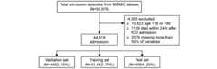 The BIDMC data set was obtained from the Medical Information Mart for Intensive Care III [23] database compiled by the Massachusetts Institute of Technology Laboratory for Computational Physiology. A total of 58,976 BIDMC admission encounters from 2001 to 2012 were recorded in this database. All inpatient encounters for which the patient aged 18 to 90 years were included in our study cohort. The admission episodes during which patients died within 24 hours after the intensive care unit (ICU) admission or missed more than 50% of the features were excluded. A flowchart of cohort formation is shown inFigure 2.