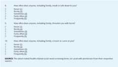 The AHC HRSN screening tool includes four questions related to interpersonal safety, including exposure to intimate partner violence, elder abuse, and child abuse. CMS adapted these questions from the Hurt, Insult, Threaten, and Scream (HITS) instrument, which has been validated in multiple settings around the world for use as a self-report or clinician-administered tool to identify intimate partner violence among women and men [22, 23, 24]. In order to broaden the scope of these questions beyond intimate partner violence, the TEP recommended editing the question stems to say “anyone, including family” instead of “your partner.” The HITS instrument is scored as a whole. Each answer option is numbered sequentially from 1 to 5 points, where “never” is 1 point and “frequently” is 5 points. Thus, scores for this domain range from 4-20. A score of greater than 10 would indicate that the beneficiary is experiencing or at risk of interpersonal violence for the purposes of the AHC Model.