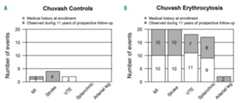 Figure 1.Thrombosis in Chuvash erythrocytosis (CE) and Chuvash control subjects by history at time of enrollment and prospectively during 11 years of observation. (A) Three of 154 controls had a history of thrombosis at study entry. Four controls developed five new thromboses during the observation period. (B) Twenty-seven of 155 CE subjects had a history of 40 thromboses at the time of enrollment. Thirty-three patients developed 37 new thromboses during the eleven-year observation period. MI: myocardial infarction; VTE: venous thromboembolism.