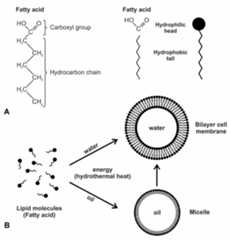 Figure 4. Amphiphilic compounds like fatty acid can self-assemble into cell-sized vesicles bounded by a membrane. (A) the polar simple fatty acid was likely a major component of the early prebiotic cell membrane due to its ability to form a vesicle. It has a hydrophilic head and a hydrophobic tail. (B) as a monolayer, a micelle can only trap oils, not water, and thus cannot be a precursor to the cell. A bilayer vesicle that trapped water and water-soluble molecules must have given rise to the cell membrane.