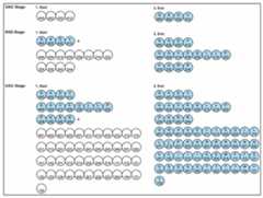Figure 8. Fusion and fission of lipid bilayers with inserted peptide molecule (seeFigure 7 for explanation). The peptide channels allowed nutrients, lipid components, and energy from the environment to enter protocells by diffusion for growth and division. These protocells form flexible, semi-permeable vesicles, capable of dividing into two such daughter vesicles or of joining with another without any moment of losing their structural continuity. Unlike living cells, the division of protocells is asymmetric, where daughter cells might inherit an unequal amount of cytoplasmic content. The transfer of information from parent to daughter cells is vertical. The cellular division of first cells inherited this property of protocells, but DNA replication created identical daughter cells.