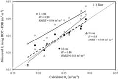 A good match between the measuredSMC (θv) from HD2-TDR and the calculatedSMC (θv) by using gravimetricSMC (θg) was obtained, with anR2 of >0.88 and aRMSE < 0.04 m3 m−3 for all three TDR probe lengths (Figure 2 andTable 1). Accuracy of the HD2-TDR for the 16 cm probe length is similar to theRMSE of 0.013 m3 m−3 by Topp et al. [11] while the HD2-TDR for the 11 and 30 cm probe lengths hasRMSE values of 0.040 m3 m−3 and 0.018 m3 m−3, respectively (Figure 2 andTable 1).