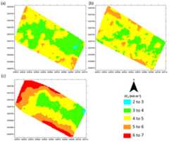 Figure 7. Spatial variability maps ofECa for the large field study (a)ECa-L (b)ECa-H (c)ECa-38 kHz.