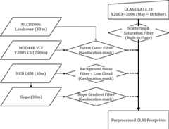 Figure 1. Preprocessing/filtering steps for determining valid GLAS waveform data. Ancillary datasets required include National Land Cover Database (NLCD) Landcover, Moderate Resolution Imaging Spectroradiometer (MODIS) Vegetation Continuous Fields (VCF) and National Elevation Dataset (NED)-derived Digital Elevation Model (DEM).