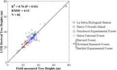 Figure 4. Comparison of LVIS tree heights with field measurements. A total of 82 plots from seven different sites are considered in this analysis. Regression analysis indicates a statistically significant relationship between LVIS tree heights and field measurements (p < 0.01).# In Sierra National Forest, there is one extremely influential observation due to old growth forests (ages > 150; [70]).