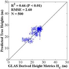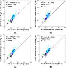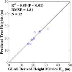 The root mean square error (RMSE) and R2 (from the linear-regression) are used to determine how well tree heights are related to each other in the inter-comparisons among field-measured, LVIS, and GLAS derived tree heights. Systematic errors related to biases in measurements are additionally considered in the interpretation of results.