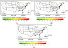 Optimizing three parameters clearly improved model performance.Figure 7 shows the distribution of tree heights over 12 FLUXNET sites. Compared to the unoptimized ASRL model predictions (Figure 7(b)), tree heights from the optimized ASRL model (Figure 7(c)) better resemble GLAS tree heights (Figure 7(a)). As shown inFigure S9, the variance of model errors to the actual observation, “(GLAS tree heights—Predicted tree heights)/GLAS tree heights” [17], decreased from 0.53 (without optimization) to 0.01 (after optimization).