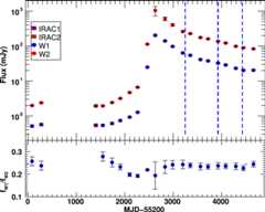 Figure 1. In the upper panel, WISE survey MIR light curves for J064722.95+031644.6 in the W1 and W2 bands. Photometry is obtained from the differential image in the unWISE image with reference to epoch 1, except for the last four epochs (see the text for details). The magnitudes in the IRAC 1 and IRAC2 bands at MJD = 56602 are used for constant fluxes. Vertical dashed lines indicate the dates of NIR spectroscopic observations. The bottom panel shows the flux ratios between the W1 and W2 bands over the period.