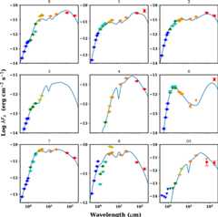 2 images in the Herschel's PACS red (160μm) and blue (70μm) bands, Spitzer's IRAC 1 (4.5μm) and Pan-STARRS'i band. IRAS 0644+0319 is seen in Figure5 as a large bright clump. J0647 is located close to the outskirts of the SFR. Several point sources are visible on both the main SFR clump and the surroundings. They are likely YSOs, probably fragmented from the same parent molecular cloud. Stars 0, 2, 4, 5, and 6 line up in a narrow strip as shown in the middle panel of Figure4, and the 160μm image shows a weak tidal stream stretching from the main star formation area to stars 7 and 8. We collect broadband photometric data for these nine sources marked in the second panel of Figure5 from the Herschel Archival Catalog, Spitzer Survey, Galactic Plane Survey of UKIDSS, and Pan-STARRS archives (Werner et al.2004; Lucas et al.2008; Pilbratt et al.2010; Chambers et al.2016). Their SEDs are plotted in Figure6. The broadband spectral slope in the IR suggests that they are candidate YSOs of Classes I and II. We also studied the MIR light curves of these objects from the WISE archive, and none showed periodic variations, which would have been the signature of dust-rich thermal pulsating AGB stars (Karovicova et al.2013).