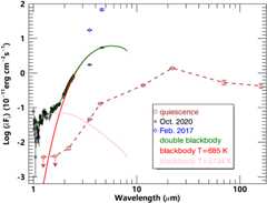 Figure 7. The SED of J0647 in the quiescence (orange circles connected by dashed lines). For comparison, the binned TSpec of 2020 October 6 and quasi-simultaneous NEOWISE fluxes are shown in black squares, and the NEOWISE fluxes at the peak of the eruption in 2017 are also plotted (blue diamonds). Note that Tspec below 1.5μm may be affected by systematic background subtraction. The best-fit model to TSpec and its constituted components are shown as solid lines.