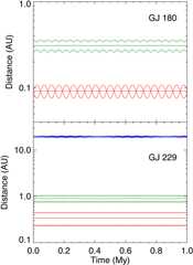 Figure 31. One sample of the dynamical simulations for GJ 180 (upper) and GJ 229 (lower) over one million years. The three curves of each color show the apastron distance, semimajor axis, and periastron distance for a planet. In the upper panel, the red curves represent GJ 180 b, and the green curves represent GJ 180 d. In the lower panel, the red, green, and blue curves represent GJ 229A c, GJ 229 b, and GJ 229B, respectively.