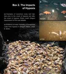Hypoxia has long been recognized as a problem for estuaries, semi-enclosed seas, and shelf regions near major river outfalls where land-based nutrient inputs exert their greatest influence on eutrophication (Diaz and Rosenberg, 2008). In the open ocean, oxygen minimum zones (OMZs) were well documented globally and found to be broadly distributed in the eastern Pacific (Helly and Levin, 2004). The dissolved oxygen (DO) concentrations in these OMZ regions reach near zero and are found well below 500 m (Helly and Levin, 2004), thus fairly distant from the nearshore, shallow waters of the continental shelf. A defining physical feature of the CCLME is coastal upwelling, which brings water from above the OMZ (~200 m depth) to the continental shelf. These waters are moderately oxygen-poor, though not typically hypoxic, and are nutrient-rich. For the CCLME, the absence of nearshore, inner-shelf (water depths less than 50 m) hypoxia changed in 2002 with reports of crab mortality from the Dungeness crab fishery (Box 2), the most valuable fishery in the region, yielding, for example, over $50 million annually in landings off Oregon alone. At that time, there was no continuous in situ DO monitoring taking place in the northern CCLME. However, ship-based observations made by the Partnership for Interdisciplinary Studies of Coastal Oceans (PISCO), the Global Ocean Ecosystem Dynamics (GLOBEC) program, and the Oregon Department of Fish and Wildlife (ODFW) revealed a hypoxic zone that extended along 50 km of the coast and stretched landward across the continental shelf into the nearshore (Grantham et al., 2004). Initially, this was thought to be a local-scale phenomenon, driven by the confluence of a strong local phytoplankton bloom that heightened respiratory oxygen demands near the seafloor and quiescent winds that slowed air-sea oxygen exchange. This view changed as observations in the North Pacific pointed to an anomalous intrusion of nutrient-rich subarctic waters that enhanced phytoplankton blooms (Freeland et al., 2003). As phytoplankton cells sank, they were fed upon by consumers such as microbes that heightened the respiratory demands for DO in ocean waters below the surface across the Northeast Pacific. Because water upwelled to the Oregon shelf was already anomalously depleted in DO (Grantham et al., 2004), and weak and retentive currents over sectors of the Oregon shelf held this hypoxic water close to shore (Barth et al., 2005), DO decreased below biologically critical thresholds and resulted in extensive die-off of marine life.