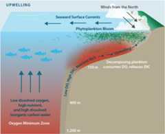 The 2002 event helped to catalyze what was to become a rapidly improving understanding of the linkages between broad-scale, climate-dependent changes in ocean chemistry and circulation and oxygen dynamics in coastal upwelling systems. Severe hypoxia, defined as DO ≤0.5 ml l–1, became a recurring feature in shelf waters despite the absence of such low values in the previous five decades of observations in the system. The most severe event occurred in 2006, when exceptionally intense upwelling of anomalously low DO waters drove the novel emergence of shelf anoxia (Chan et al., 2008). Importantly, these events took place within the context of new research from offshore and open ocean time-series observations that began to reveal broad-scale trends of DO declines (Whitney et al., 2007; Stramma et al., 2008). Termed “ocean deoxygenation,” low DO is now understood to be a highly dynamic variable rather than a relatively static property of the global ocean. New research indicated that oxygen concentrations in the ocean are responsive to anthropogenic climate change through the direct effects of warming on gas solubility, and through the indirect effects of warming on the supply of oxygen to deep ocean layers and of ocean circulation (Breitburg et al., 2018). In upwelling systems, such DO declines in oceanic source waters translate into an amplified risk for hypoxia. As water transits across productive shelf waters, respiration by microbes further draws down DO, leading to hypoxia and even anoxia.