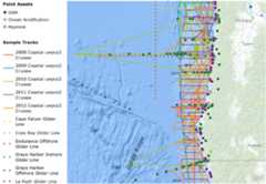 Simultaneous with efforts to collect time series of dissolved oxygen at selected subsurface locations off the Oregon coast, including those by PISCO, other groups were collecting and analyzing subsurface oxygen data from large-scale spatial surveys off Oregon and elsewhere in the CCLME (e.g., work by NOAA’s Northwest Fisheries Science Center off Oregon and Washington and by Canada’s Department of Fisheries and Oceans further north off Vancouver Island). These surveys included cross-shelf and vertical sections of DO measured by an underwater ocean glider off Newport, Oregon, that showed the two-dimensional extent of the hypoxia zone off central Oregon (Adams et al., 2013). Using data from a variety of NOAA surveys, Peterson et al. (2013) identified regions of hypoxia that tended to occur north of 42°N and that were most severe over the widest areas of the continental shelf. Hypoxic waters covered up to 62% (15,600 km2) of the continental shelf during some years and <10% in others.
