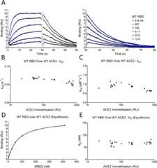 (A) Overlay of traces showing association and dissociation when WT RBD is injected for 30 s at the indicated concentration over immobilised WT ACE2. The right panel shows an expanded view of the dissociation phase. The blue lines show the fits used for determining the kon and koff. The kon was determined as described inFigure 2—figure supplement 2. The koff (B) and kon (C) values measured at different levels of immobilised ACE2 are shown. (D) The equilibrium KD was determined by plotting the binding at equilibrium against [RBD] injected. Data from experiment shown in (A). (E) The equilibrium KD measured at different levels of immobilised ACE2 are shown.