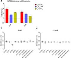 Affinity and kinetic data for RBD variants and ACE2 variants.