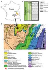 The holotype ofRhinochelys amaberti Moret (1935) (UJF-ID.11167) was found in the Vallon de la Fauge, near Villard-de-Lans in the Isère department (France) (Fig. 1) (Moret, 1935). The Vallon de la Fauge area belongs to a larger geological and geographical unit called the Vercors. In the northeastern Vercors, where the Vallon de la Fauge is located, the thick carbonate successions of the Barremian-Early Aptian are surimposed by bioclastic limestone from the Late Aptian (about 15 m thick), followed by several meters of Albian greenish sandstones and glauconitic marls in decimetric beds (Fig. 1). These Albian deposits are known locally as ‘Béton phosphaté’ because of their abundant phosphatized ammonites and bioclasts (Arnaud, 1988). The sandy and marly deposits overlying the carbonates belong to the Marnes Bleues Formation, which extends from the Aptian to the Cenomanian (Bréhéret, 1997) (Fig. 1). The outcrop in the Vallon de la Fauge solely consists of these glauconitic and sandy marls and has been dated from theStoliczkaia dispar Zone (Late Albian, late Early Cretaceous;Moret, 1935). Thus,Rhinochelys amaberti is roughly contemporaneous with the specimens from the Cambridge Greensand Member (Fig. 2) (West Melbury Marly Chalk Formation, UK;Hopson, 2005;Martill & Unwin, 2012) and bears the same coloration as the specimens (seeFig. S1–S8) from Cambridge Greensand Member (Fischer et al., 2014).