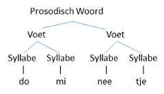 Voor de klankopbouw van Nederlandse woorden zijn drie prosodische categorieën van belang: delettergreep, devoet, en hetprosodisch woord. Een of meer lettergrepen vormen een voet, en een of meer voeten een prosodisch woord. Deze drie prosodische categorieën vormen dus een prosodische hiërarchie. Het woorddomineetje bijvoorbeeld bestaat uit vier lettergrepen, die twee voeten vormen,domi enneetje, tezamen op hun beurt één prosodisch woord vormend. De prosodische structuur van dit woord kan als volgt worden weergegeven: