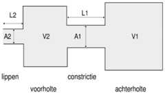 Voor de productie van klinkers, zoals deu, kan het aanzetstuk in een sterk vereenvoudigde weergave voorgesteld worden zoals in Figuur 4.Figuur 4. De ‘tweelingbuis’ als model voor de klinker /u/ (Bron: Rietveld & Van Heuven 2016: 143)