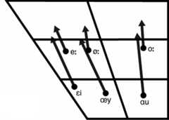 Een iets ander beeld van de Nederlandse diftongen wordt geschetst in Van der Harst (2011:173), die op basis van akoestische metingen tot het klinkerdiagram in Figuur 3 komt. Uit Figuur 3 blijkt dat er een aantal verschillen zijn tussen Nederlands-Nederlands en Belgisch-Nederlands in de fonetische realisatie van de tweeklanken: in het Nederlands-Nederlands is de aanzet van de tweeklanken opvallend lager/opener en is de mate van verglijding (tussen het eerste en tweede element) sterker dan in het Belgisch-Nederlands. Bovendien wordt het tweede element van deœy in het Belgisch-Nederlands veel meer naar voren in de mond gerealiseerd.